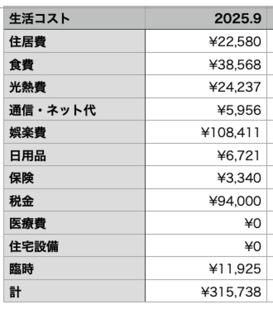 住居費・食費はまあ想定に近いというか、外食1回して半年先分くらいまでコーヒーなど買いだめしていて3万円台に収まってるんだから意外に絞って暮らしたな、という印象。