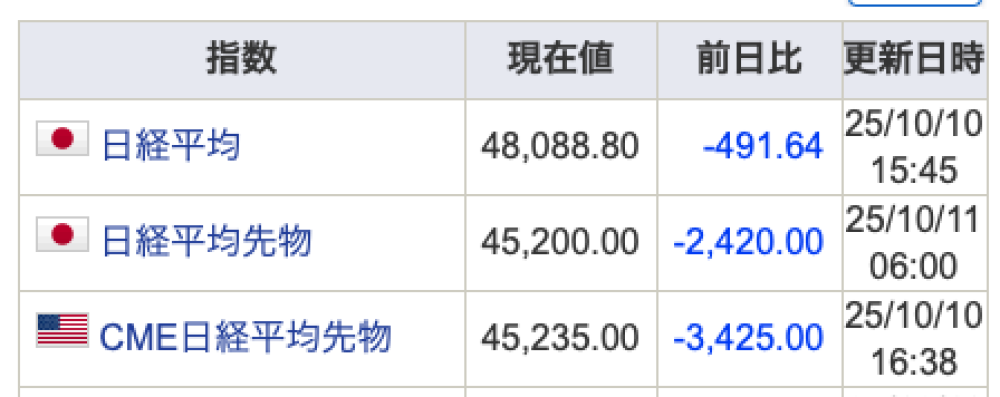 昨日のザラ場後の「公明党連立離脱」の後の夜間の値動きは思ったよりもマイルドな下落だったんですが、ボクが寝てからだと思いますが米国市場が結構な大幅値下げ。それに釣られる「いつもの日経」でガラガラと値下がりして、数日前に騰がったときも驚いた値幅でしたが今回の下落もまた驚く感じの値下がりのようです。