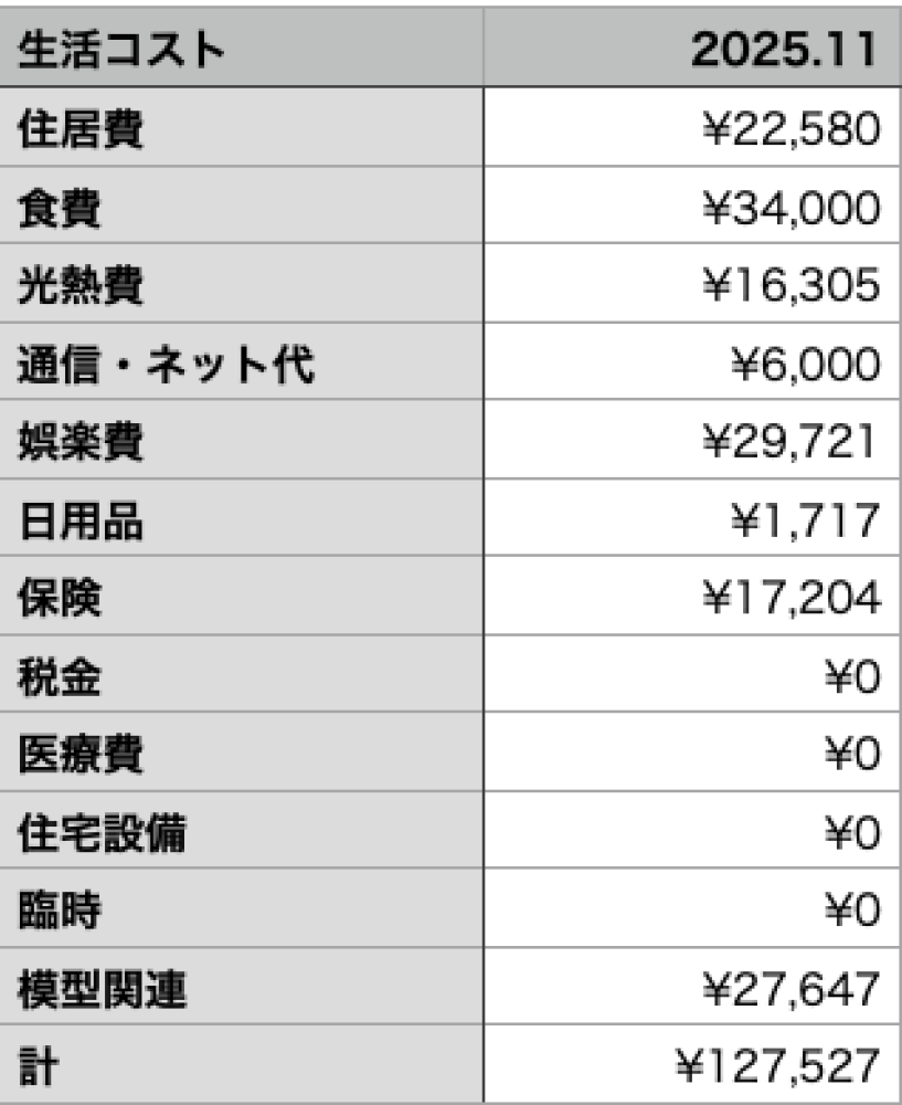 ちなみに「模型関連」の費用は生活費とは別なんで「計」の欄では集計対象にしてません。こっちの額は確定申告で基本経費になる…ハズ、です。11月はとなモの参加費や版権料を支払ったのでそこそこの額になりました。他、消耗品の購入などですね。