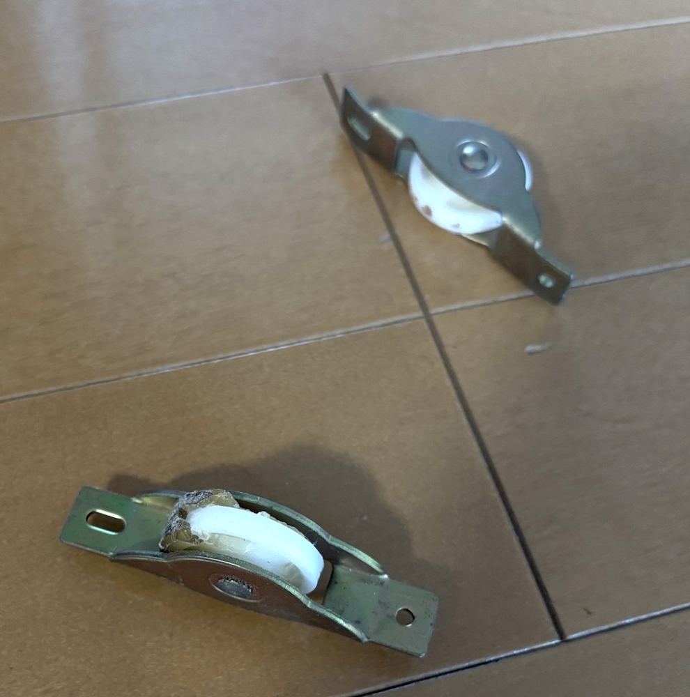 原因は米粒とかそんなんじゃなく、戸に付いていた戸車の劣化でした。車輪に使われていた半透明の樹脂が黄ばんでボロボロになって、軸受を構成している白い樹脂から剥がれまくってます。これが、戸を動かす度に崩れてボロボロに溝に撒き散らされているという状態でした('A`)。結果的に車輪の径も小さくなって戸を擦っている状態…。樹脂も完全に剥がれればまだ車輪の形状になって「車」の用を果たしたかもしれません。しかし画像左下のように「一部がこびりついて残ったまま」ですと満足に回転もできません。