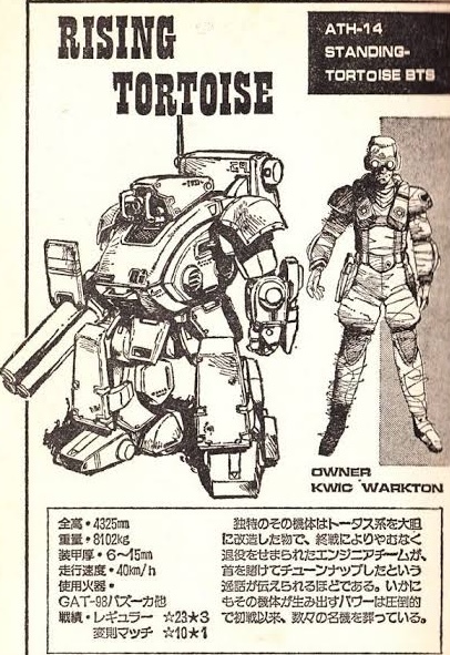 ライジングトータスはボトムズのサイドストーリーである「青の騎士ベルゼルが物語」に出てくるヘビー級ATというやつ。