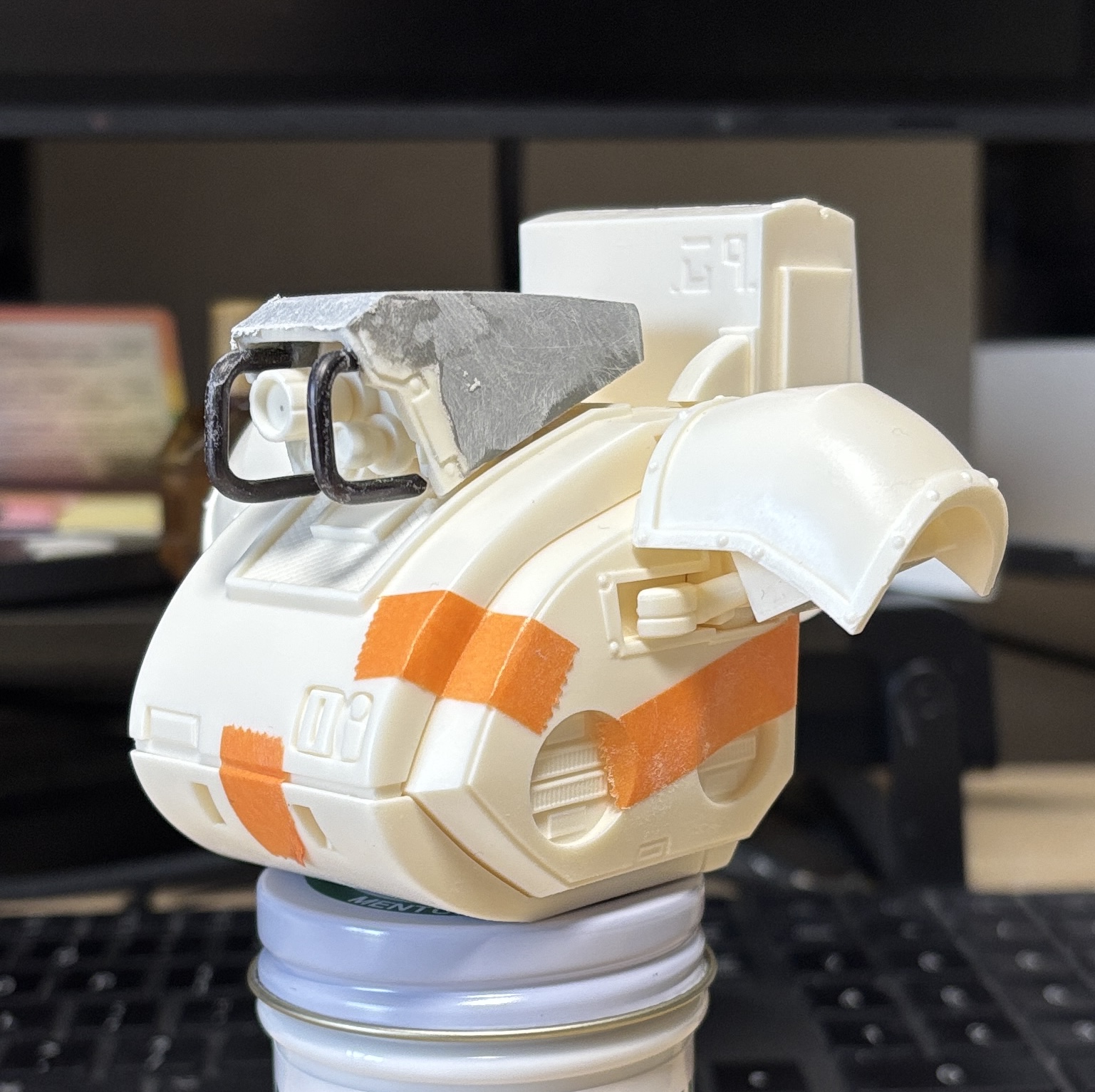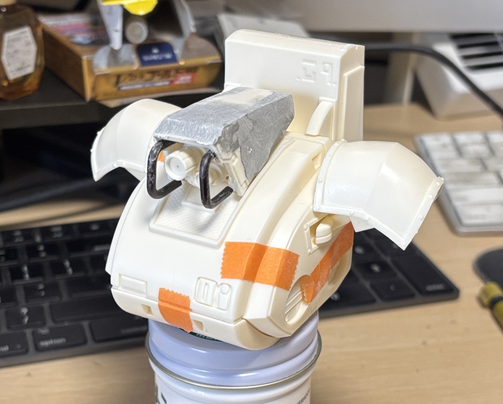 あとは頭のてっぺんもイラストに近づけるよう角度を付けて直線的に整える。後部は絞るように細まっていく造形だったんですが、イラストでは別に絞ってないように見えましたからパテを盛り足してあまり理ぼり込まないように整えてみました。