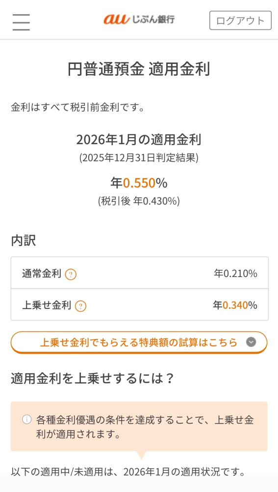 今んとこ、利用口座の中ではauじぶん銀行が一番高いです。