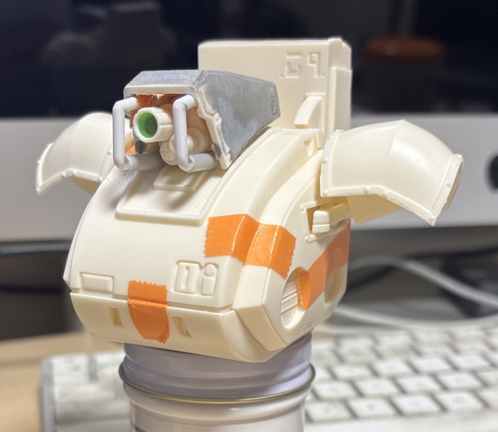 雰囲気でてきましたね(・∀・)。このカメラガードをどうマウントさせるかはまたちょっと解釈と造形が必要になりますが、ボクがイメージしている挿絵のライジングトータスの顔、に近づいてきたかなと。