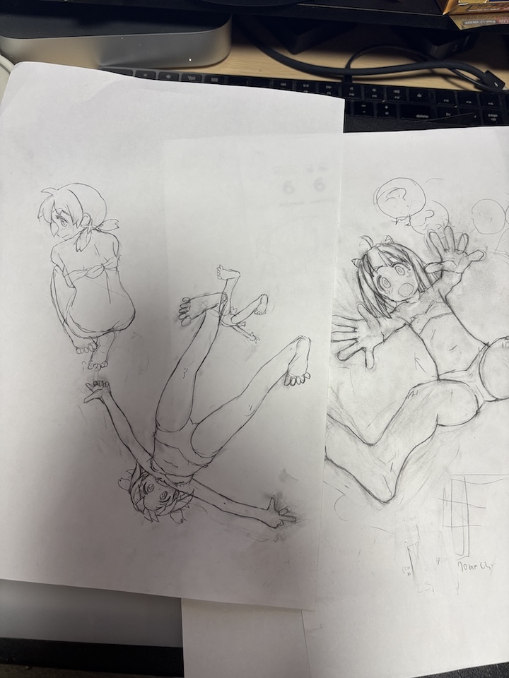 まずはイメージを下書きして、それぞれをクリンナップ。最近は仕上げには液タブとCLIP STUDIO PAINTを使っています。諸般の事情で使い慣れてるフォトショは別の古いPCなもんで…液タブのドライバ等動作環境の確保は新しい方のPC(Mac mini)という具合。