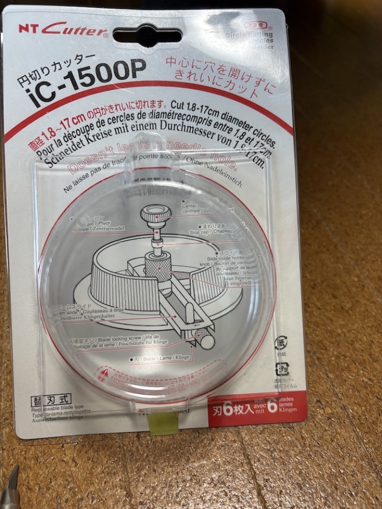 カットにはサークルカッターを使います。コンパスタイプのもありますが、多少厚みがある素材でも綺麗にカットするならこちらの方が確実ですね。NTカッターのやつ。↓