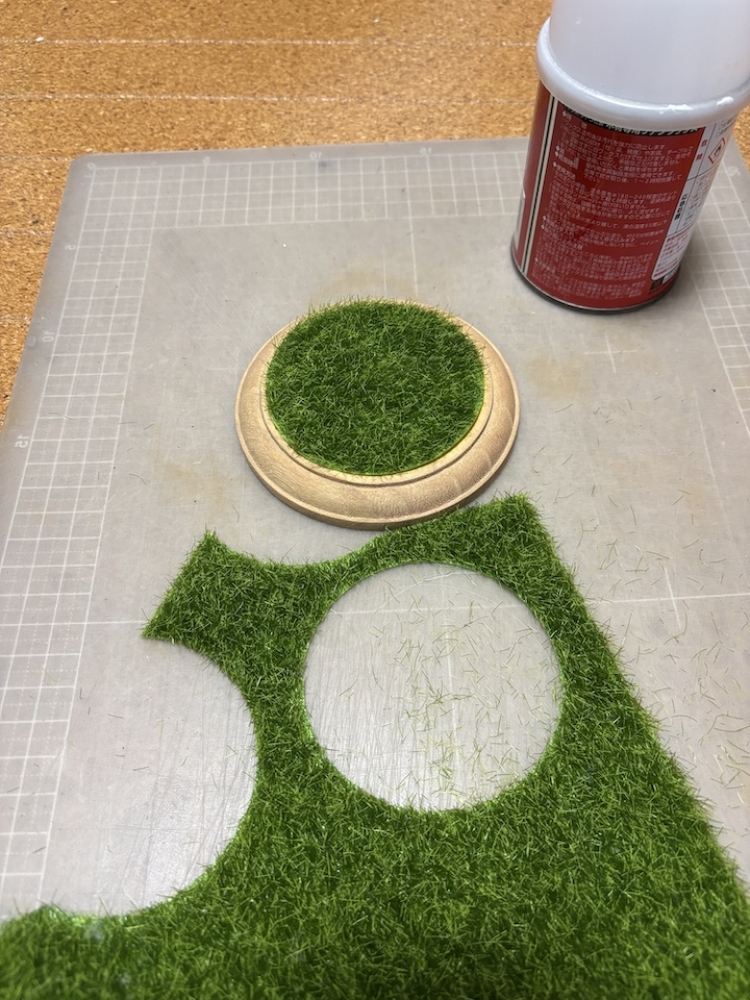 「ウマ娘」のときは一貫して木製ベースを使っています。たまの木工作業が好きなのと、色合いや雰囲気が良いかなと思い。木製ですから仕上げはニスかワックスというところで、「ウマ娘」の場合はワックスでやっています。ワックスは乾いていくと意外にもマット調に整うんですよね。上に人工芝を貼るのでベースが「土」っぽい感じになるのも調和を感じます。