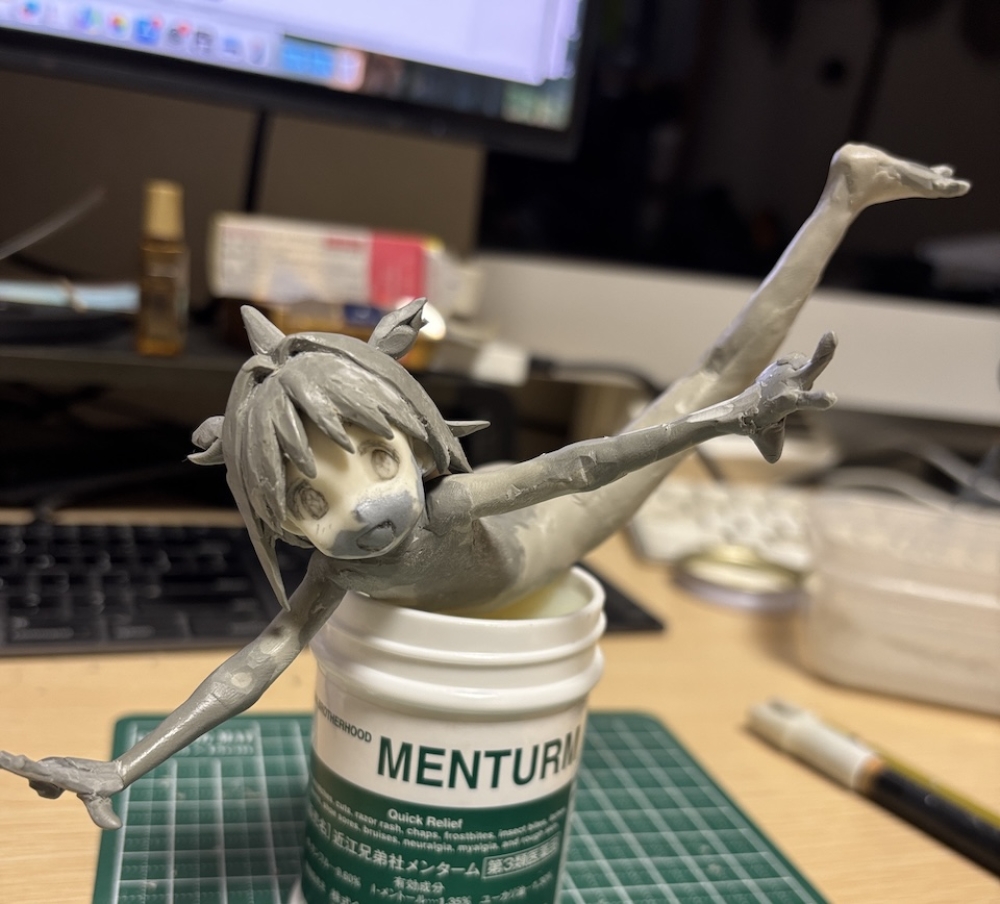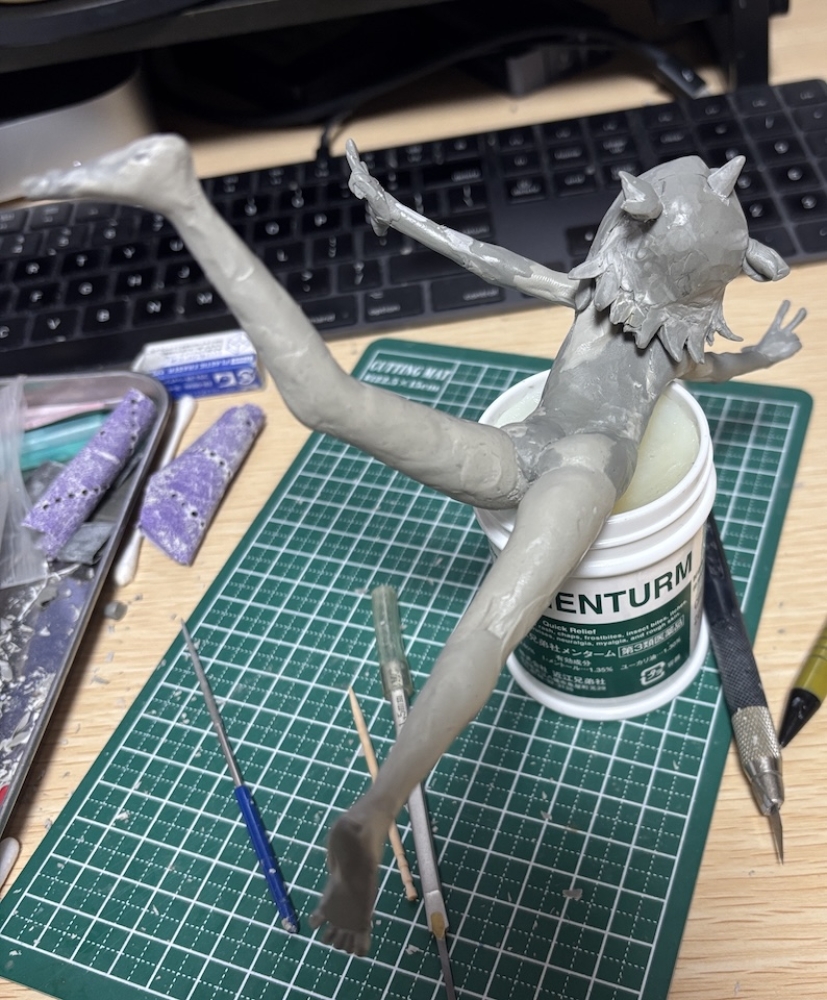 手足を一通りつけてみて、ポーズの確認をしつつ肉の盛り付けをします。基本、もみじと同様「付けすぎない」ことに注意しつつ、欲しいところに盛り足しというスタンス。最初ちんちくりんに見えてた箇所も、この過程でもっともらしくなってきます( ˘ω˘)。